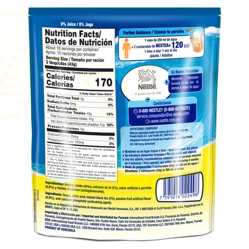 Ingredientes: Azúcar, ácido cítrico, extracto de té (3%), sabor artificial a parchita (0.8%) y fosfato tricálcico (antiaglomerante).